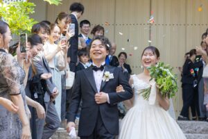 祝福のフラワーシャワーをくぐり