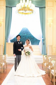 そして合図をおくるとなんとチャペルの扉から両家の父とともにかなさんの入場です!